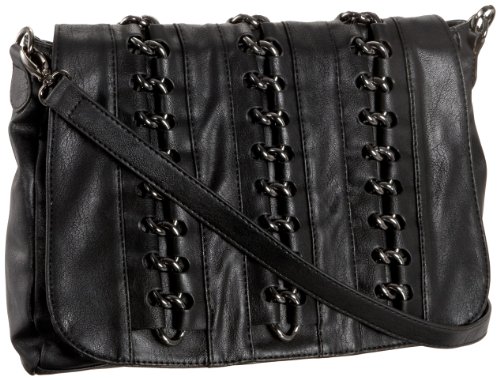 | Made from textured leatherette. Pewter-tone hardware and front woven chain detail. Back zip wall pocket. Adjustable cross-body strap that can be detached so the bag can be used as a clutch. Front flap magnetic snap closure. Roomy fully lined fabric compartment. Interior zip wall pocket and cell and sunglass slip pouches. BEFORE PURCHASING, PLEASE COMPARE THE SIZE OF THIS HANDBAG TO ONE OF YOUR OWN FAVORITE BAGS. ...Read more |